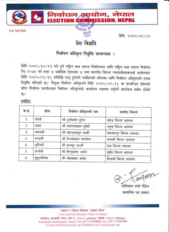 त्यस्तै मधेशमा धनुषा जिल्ला अदालतका न्यायाधीश नारायणप्रसाद सुवेदी, बागमतीमा मकवानपुरका जिल्ला न्यायाधीश महेन्द्रबहादुर कार्की, गण्डकीमा कास्की जिल्ला अदालतका न्यायाधीश केशवप्रसाद बास्तोला निर्वाचन अधिकृत बनेका छन् ।