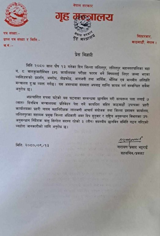 उपत्यका प्रहरी कार्यालयका डीआईजी लालमणि आचार्य नेतृत्वमा बनेको समितिमा ललितपुरका सहायक प्रमुख जिल्ला अधिकारी अमरदीप सुनुवार र राष्ट्रिय अनुसन्धानका उपअनुसन्धान निर्देशक बासु सिग्देल सदस्य छन् ।