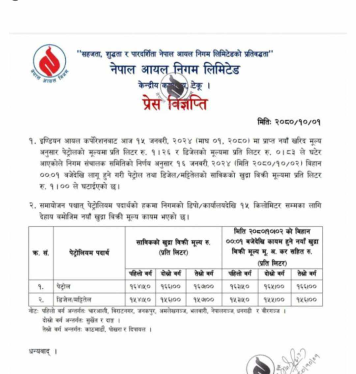 नेपाल आयल निगमका अनुसार पेट्रोलको मुल्य १.६ र डिजेलको मूल्य ०.८३ घटाइएको हो । उक्त मूल्य मंगलबारदेखि लागू हुने भएको छ ।
