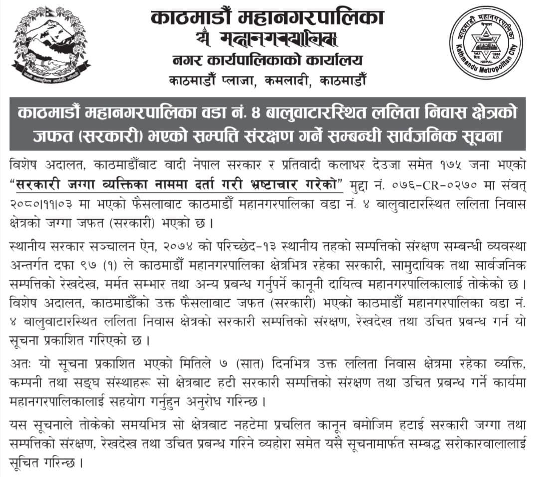 ‘विशेष अदालत, काठमाडौँबाट वादी नेपाल सरकार र प्रतिवादी कलाधर देउजा समेत १७५ जना भएको “सरकारी जग्गा व्यक्तिका नाममा दर्ता गरी भ्रष्टाचार गरेको” मुद्दामा २०८० फागुन ३ गते भएको फैसलाबाट काठमाडौँ महानगरपालिका वडा नं।४ बालुवाटारस्थित ललिता निवास क्षेत्रको जग्गा जफत (सरकारी) भएको छ ।’ महानगरपालिकाद्वारा जारी सुचनामा भनिएकाे छ, ‘स्थानीय सरकार सञ्चालन ऐन, २०७४ को परिच्छेद – १३ स्थानीय तहको सम्पत्तिको संरक्षण सम्बन्धी व्यवस्थाअन्तर्गत दफा ९७ (१) ले काठमाडौँ महानगरपालिका क्षेत्रभित्र रहेका सरकारी, सामुदायिक तथा सार्वजनिक सम्पत्तिको रेखदेख, मर्मत संभार तथा अन्य प्रबन्ध गर्नुपर्ने कानुनी दायित्व महानगरपालिकालाई तोकेको छ । विशेष अदालत, काठमाडौंको उक्त फैसलाबाट जफत (सरकारी) भएको काठमाडौँ महानगरपालिका वडा नं.४ बालुवाटारस्थित ललिता निवास क्षेत्रको सरकारी सम्पत्तिको संरक्षण, रेखदेख तथा उचित प्रबन्ध गर्न यो सूचना प्रकाशित गरिएको छ ।’