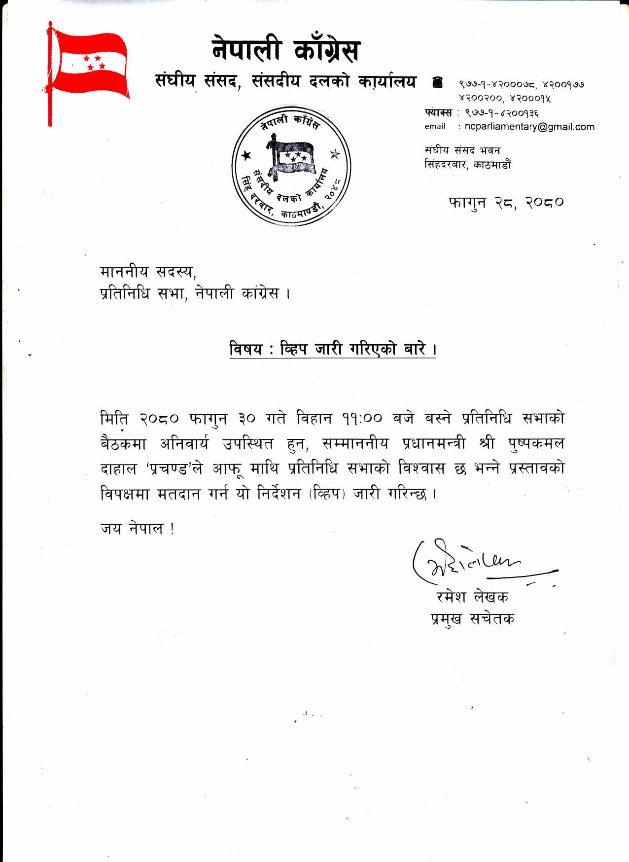 सोमबार कांग्रेस संसदीय दलका प्रमुख सचेतक रमेश लेखकले सबै सांसदहरूका नाममा पत्र लेख्दै प्रधानमन्त्री प्रचण्डको विश्वासको मतको विपक्षमा मतदानका लागि ह्वीप जारी गरिएको जानकारी दिएका हुन् । गत २१ फागुनमा प्रधानमन्त्री प्रचण्डले तत्कालीन नेपाली कांग्रेस नेतृत्वको सात दलीय गठबन्धन त्याग्दै २०७९ पुस १० गते बनेको एमालेसहितको नयाँ गठबन्धनबाट सत्ता यात्रा अघि बढाएका थिए।