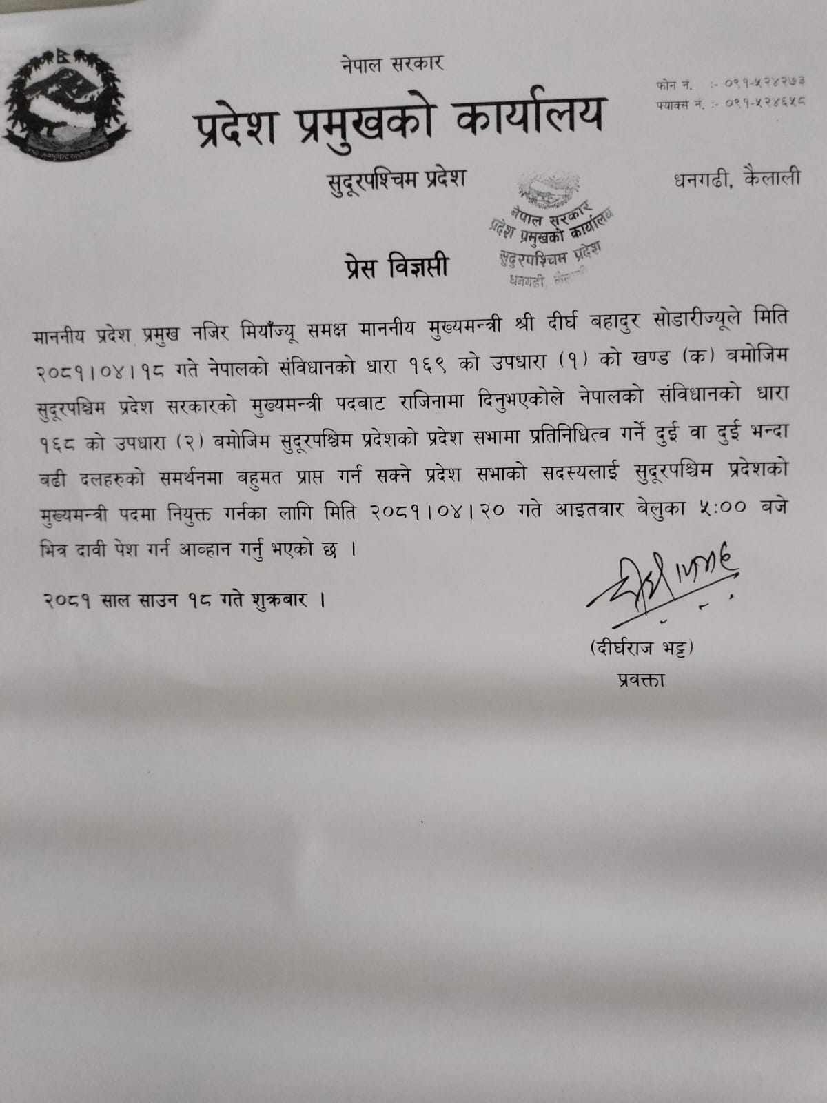काठमाडौं । सुदूरपश्चिम प्रदेशका मुख्यमन्त्री दीर्घबहादुर सोडारीले पदबाट राजीनामा दिएका छन् ।