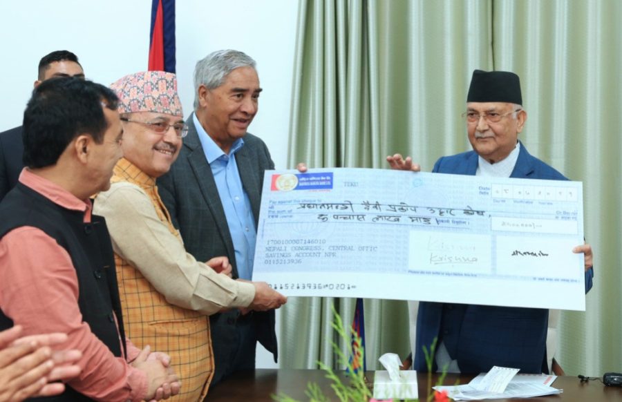 क्षतिपश्चात् सभापति देउवासहित नेताहरूले असोज २० गते प्रधानमन्त्री ओलीलाई भेटेर राष्ट्रिय वाणिज्य बैंकको ५० लाख रुपैयाँको चेक हस्तान्तरण गरेका थिए। उक्त चेकमा कार्तिक ८ गतेसम्म मिति राखिएको थियो। तर, उक्त मितिमा पनि रकम जम्मा भएन। लामो समयसम्म पनि प्रधानमन्त्री तथा मन्त्रिपरिषद् कार्यालयले प्रधानमन्त्री दैवीप्रकोप उद्धार कोषमा कांग्रेसले दिएको चेक जम्मा नभएपछि कांग्रेसको आलोचना सुरु भएको थियो। कोषले सार्वजनिक गरेको विवरणमा गत कार्तिक ३० गते भने कांग्रेसले दिएको चेक जम्मा भएको देखिएको छ।