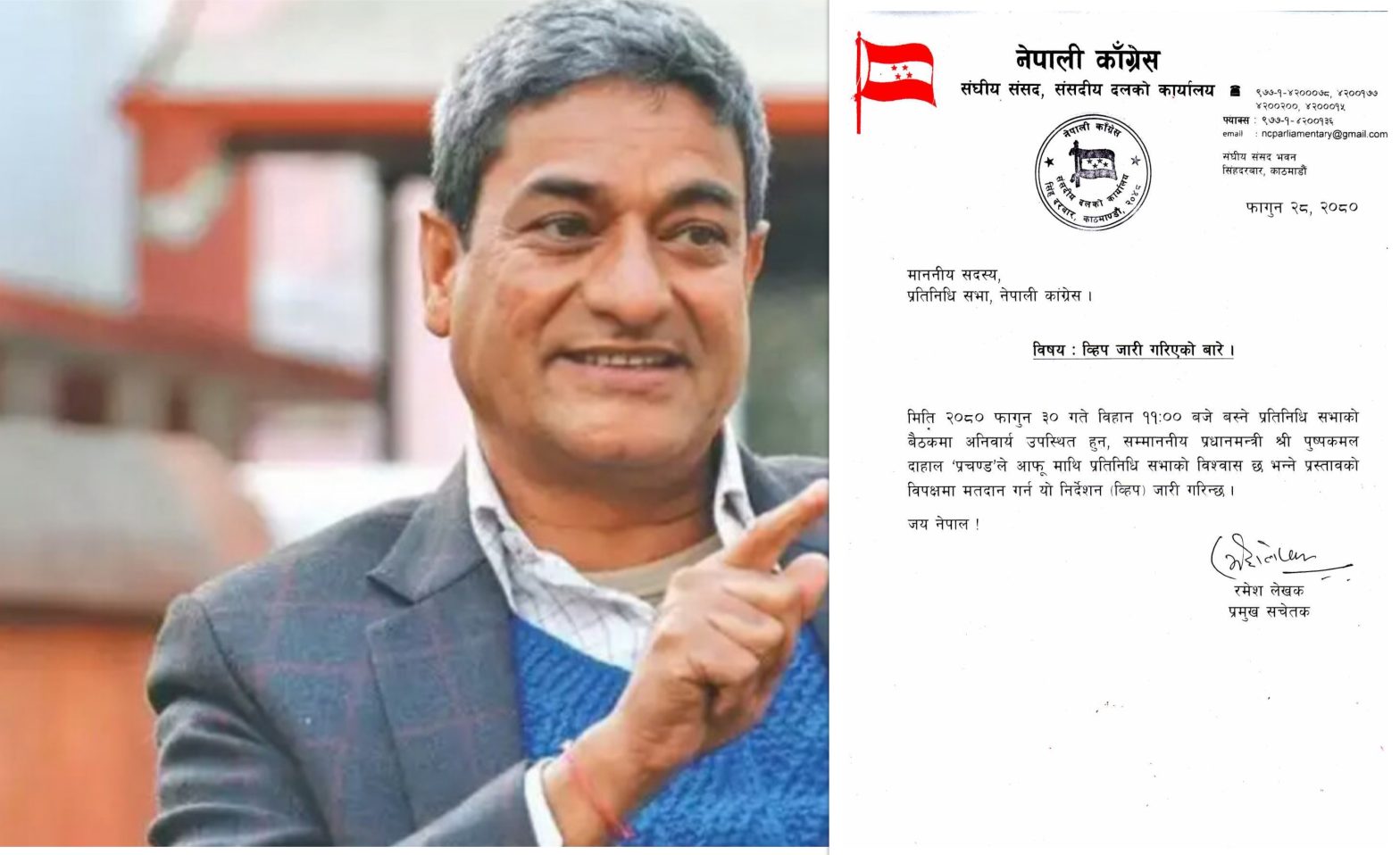 प्रधानमन्त्रीलाई विश्वासको मत नदिन सांसदलाई कांग्रेसको ह्वीप