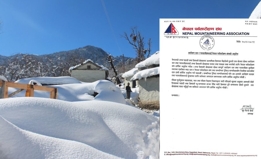 जल तथा मौसम विज्ञान विभागको मौसम पूर्वानुमान महाशाखाले जारी गरेको सूचनामा आगामी केही दिनसम्म हिमाली भू–भागमा हल्कादेखि भारी हिमपातको सम्भावना रहेको बताइएकाले संघले थप सर्तकता अपनाउन आग्रह गरेको हो ।
