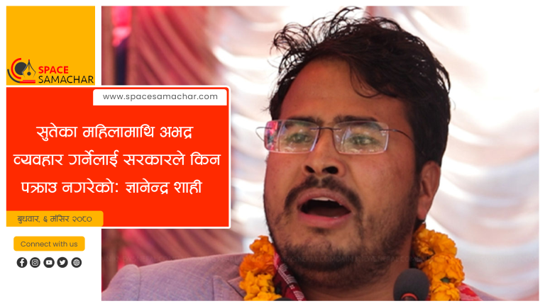 काठमाडौं । राष्ट्रिय प्रजातन्त्र पार्टी संसदीय दलका प्रमुख सचेतक एवम् प्रवक्ता ज्ञानेन्द्र शाहीले काठमाडौंमा राति सुतेका महिलाहरुमा माथि अभद्र व्यवहार गर्नेहरुलाई तत्काल पक्राउ गर्न सरकार समक्ष माग गरेका छन।