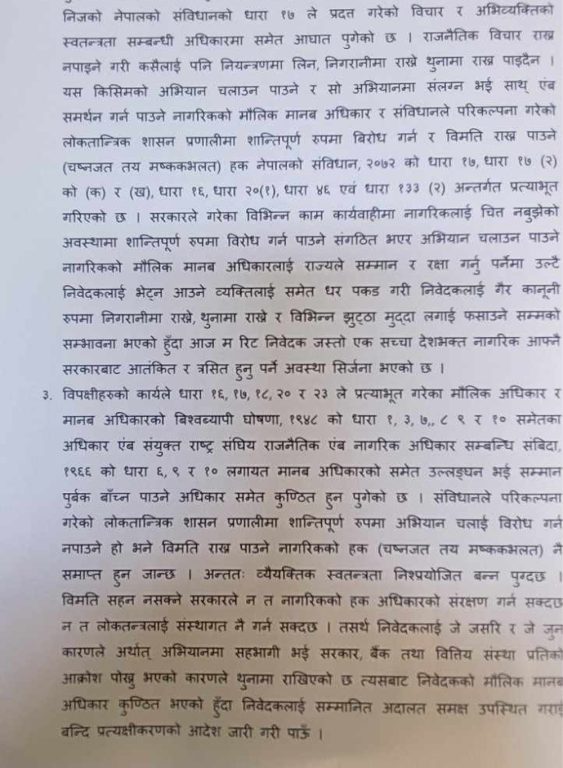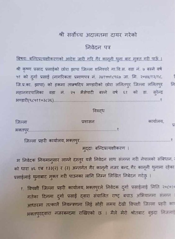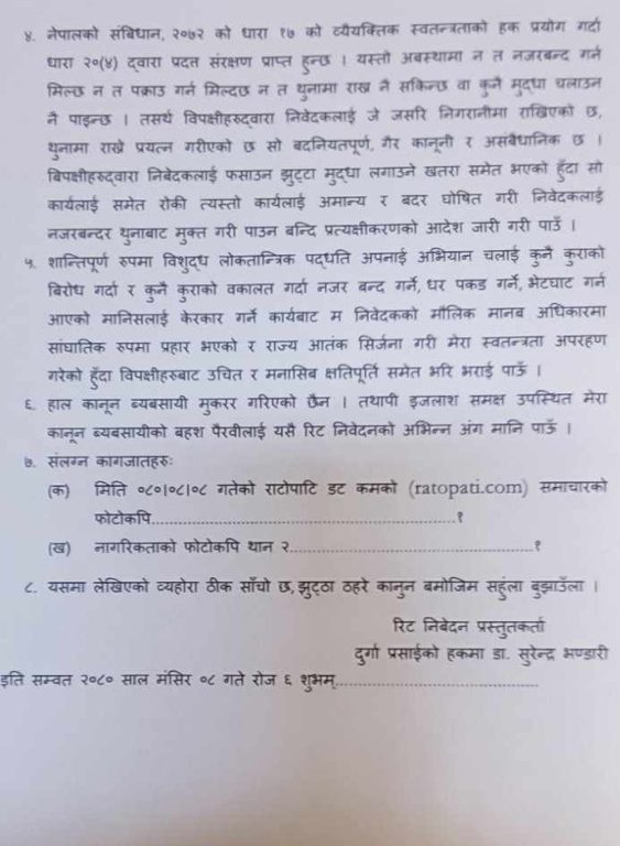 नजरबन्द गरी मौलिक मानव अधिकार कुण्ठित गरेको जिकिरसहित वरिष्ठ अधिवक्ता डा. सुरेन्द्र भण्डारी जिल्ला प्रशासन कार्यालय भक्तपुर र जिल्ला प्रहरी कार्यालय भक्तपुरलाई विपक्षी बनाएर सर्वोच्च अदालतमा रिट दर्ता गराएका हुन। संविधानले व्यक्तिलाई स्वतन्त्र अभिव्यक्ति राख्न पाउने मौलिक अधिकार दिएको भए पनि संविधानको धारा (१७) विपरित उनलाई बन्दी बनाएको भन्दै अदालतमा पुगेका हुन।