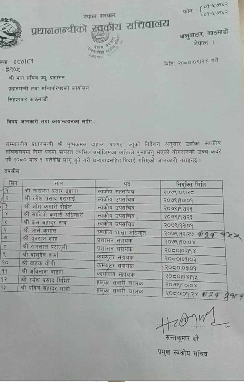 ५ जना उपसचिव, एकजना शाखा अधिकृत, तीनजना प्रशासन सहायक, दुईजना कम्प्युटर सहायक, एकजना कार्यालय सहायक र २ जना हलुका सवारी चालकलाई बिदा गरेको सचिवालयले प्रधानमन्त्री तथा मन्त्रिपरिषद् कार्यालयका सचिवलाई पत्रमार्फत् जानकारी गराएका छन् ।